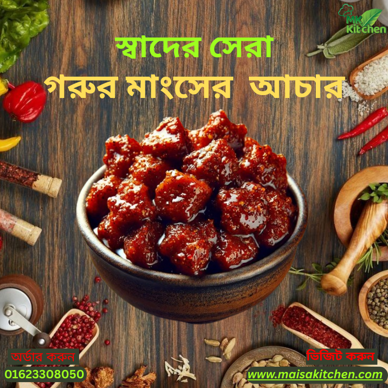ঘরে তৈরি খাঁটি মসলায়, স্বাস্থ্যসম্মতভাবে প্রস্তুতকৃত গরুর মাংসের আচার এখন আপনার হাতের নাগালে।
